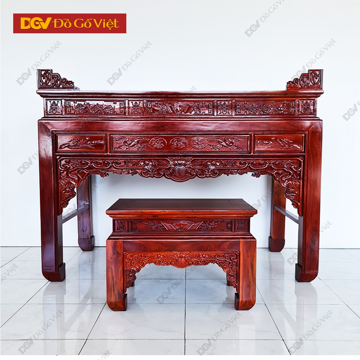 Bộ sập thờ chất liệu gỗ hương gia lai thuần Việt 100%, chạm trổ hoạ tiết hoa lá mây vân tinh xảo, kích thước 2m tiêu chuẩn cho phòng rộng.